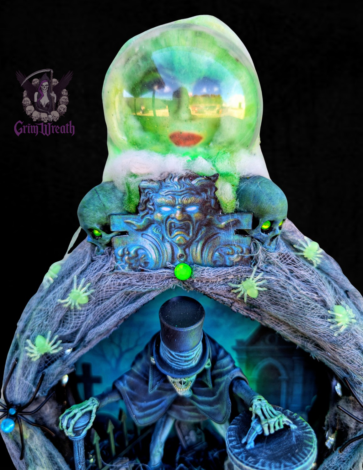 Step into the séance room with this eerie, 8x8 hand-crafted wreath inspired by Haunted Mansion. Dripping in ghostly blues and antique greens, it’s adorned gothic details that whisper *“Welcome, foolish mortals.”* Perfect for those who love timeless elegance with a chilling twist