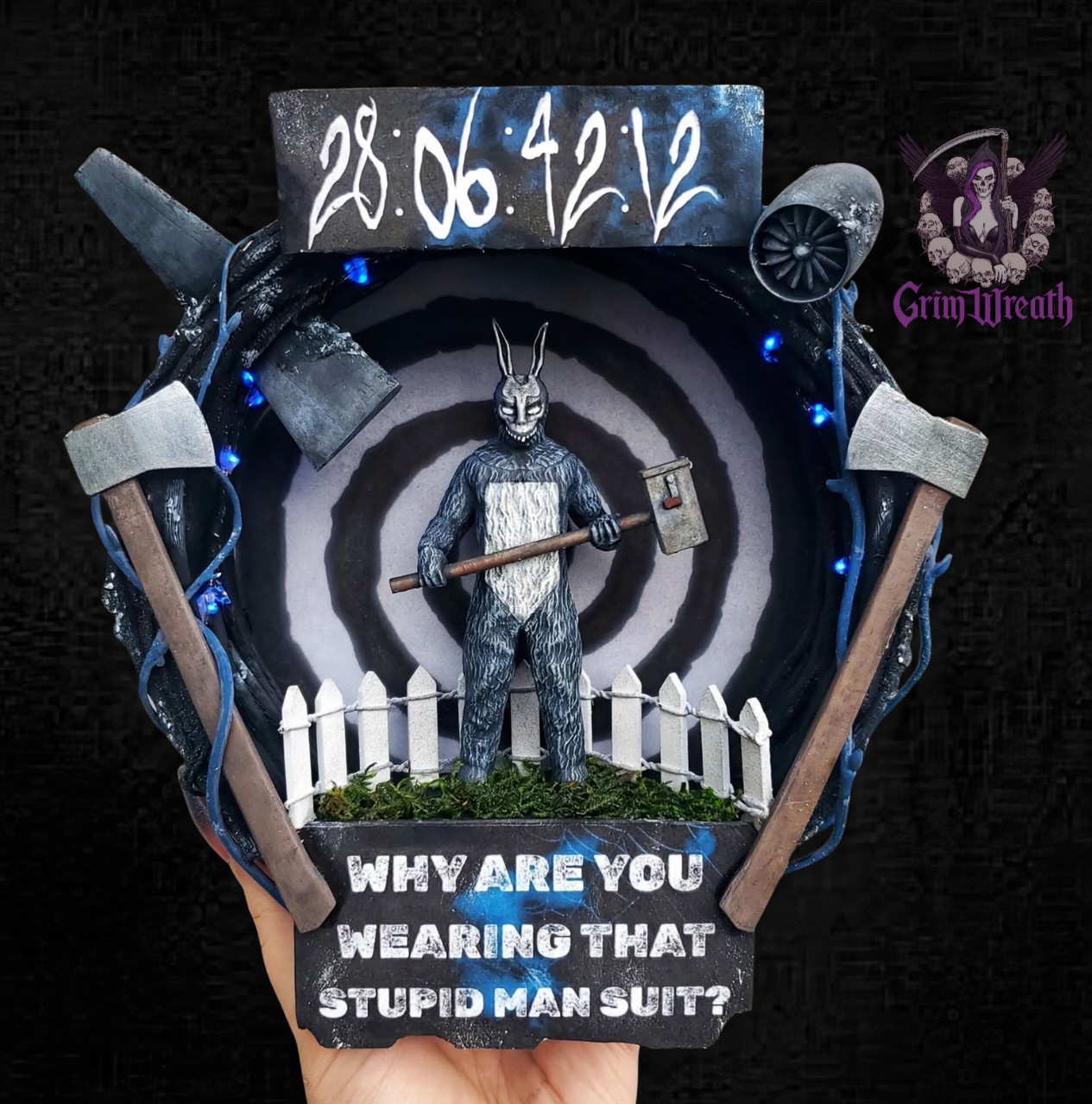 Step into the twisted world of *Donnie Darko* with this eerie 8" mini wreath, handmade by artist Grimwreath. Featuring haunting details inspired by Frank the Bunny, it's the perfect creepy-cute addition for fans of cult horror.