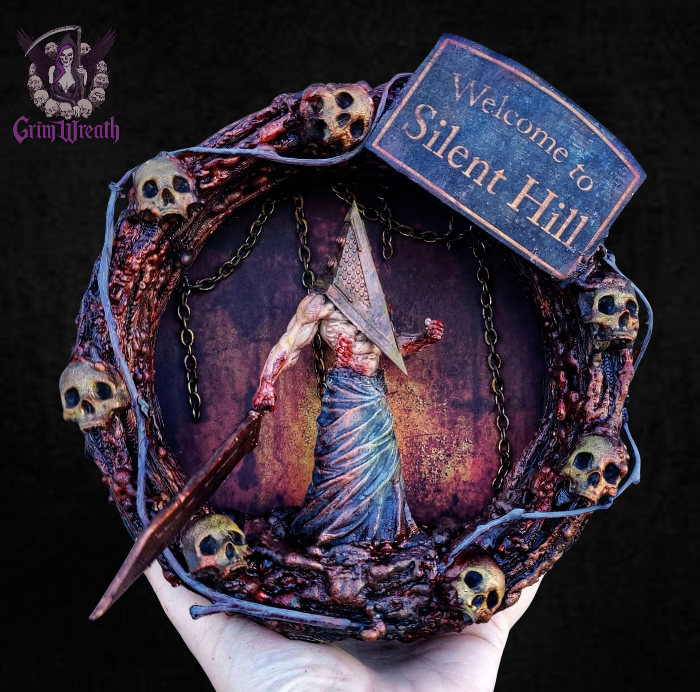 Enter the fog with this 8" Pyramid Head mini wreath by Grimwreath. Handcrafted with rusted reds, chains, and eerie Silent Hill details—it's a haunting tribute to the executioner himself.
