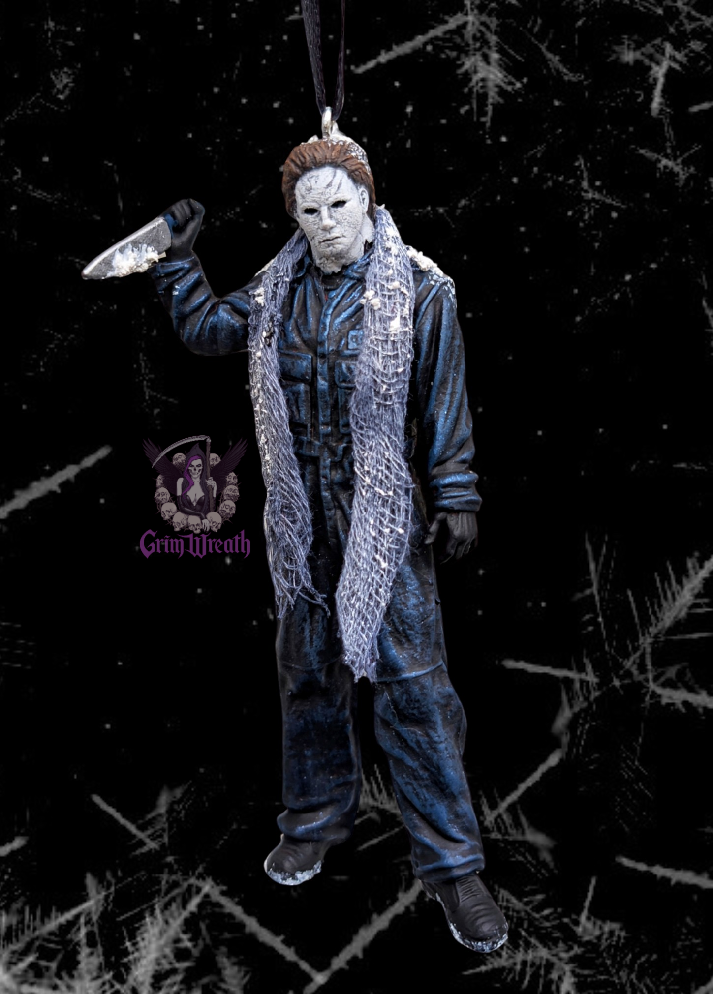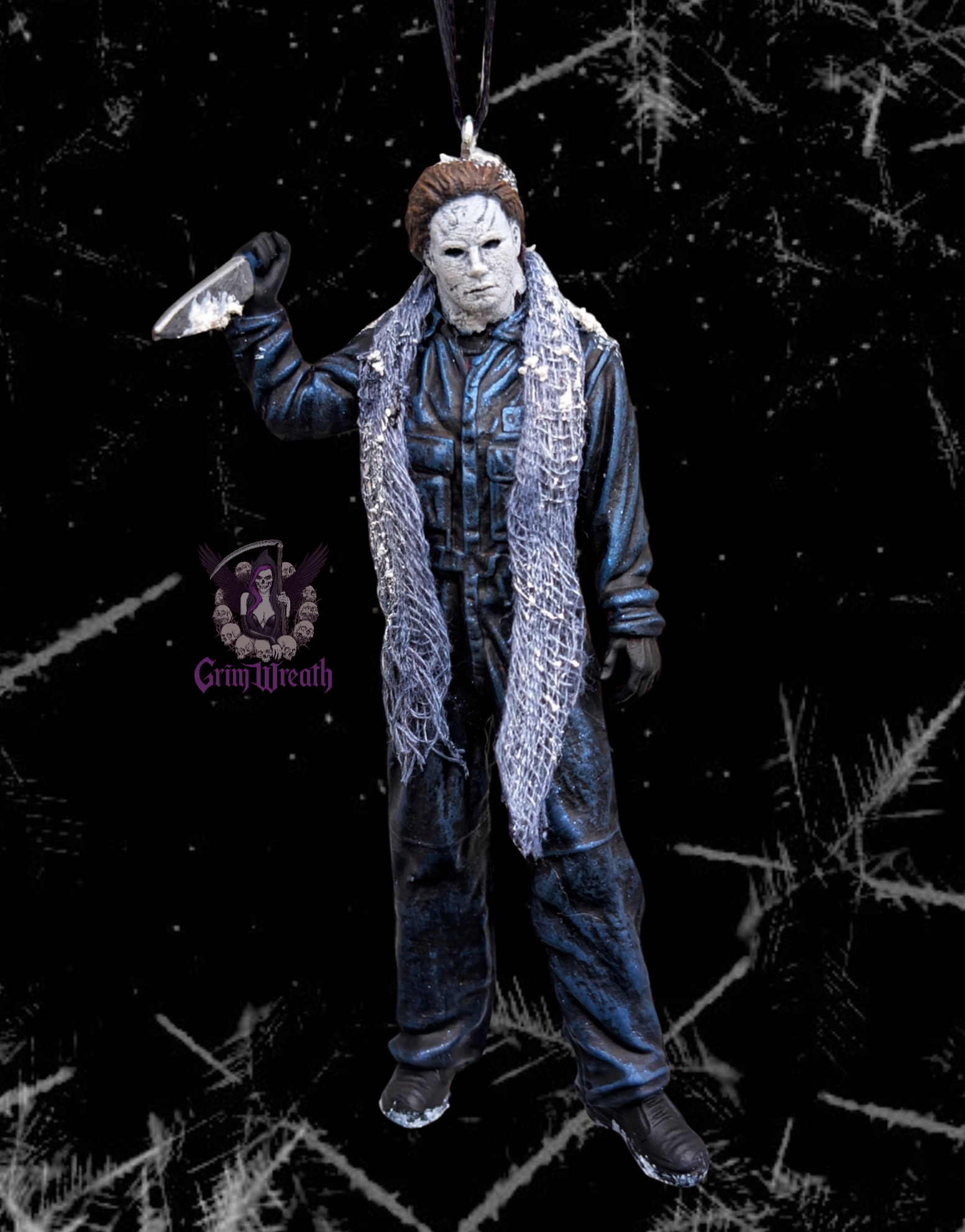 Bring a chilling touch to your holiday tree with this hand-crafted mini terror features the iconic Shape bundled in snowy, cold-season dread—perfect for horror lovers who want their Christmas a little… *stabby*. Frosted details, eerie winter accents, and Grim Wreath’s signature spooky charm make this the ultimate addition to any horror-themed holiday décor. Hang it up if you dare!