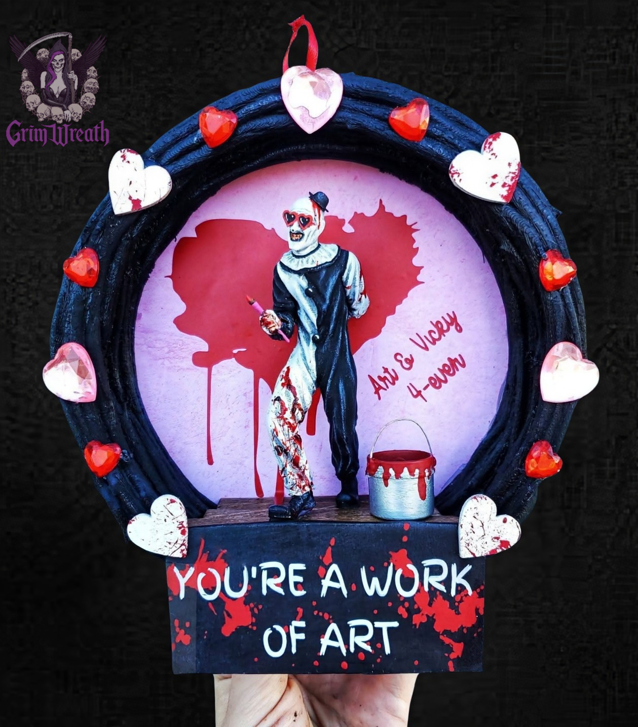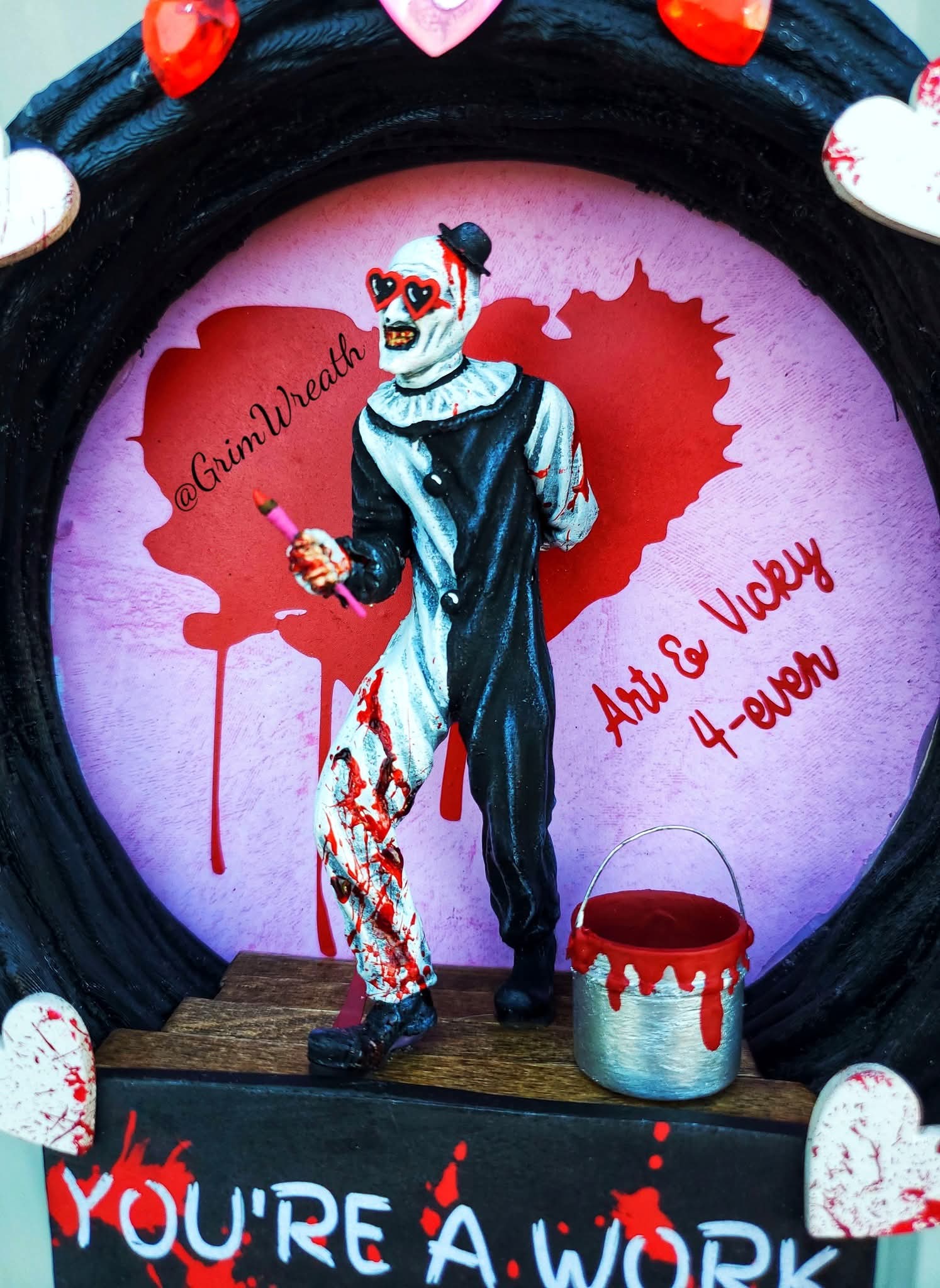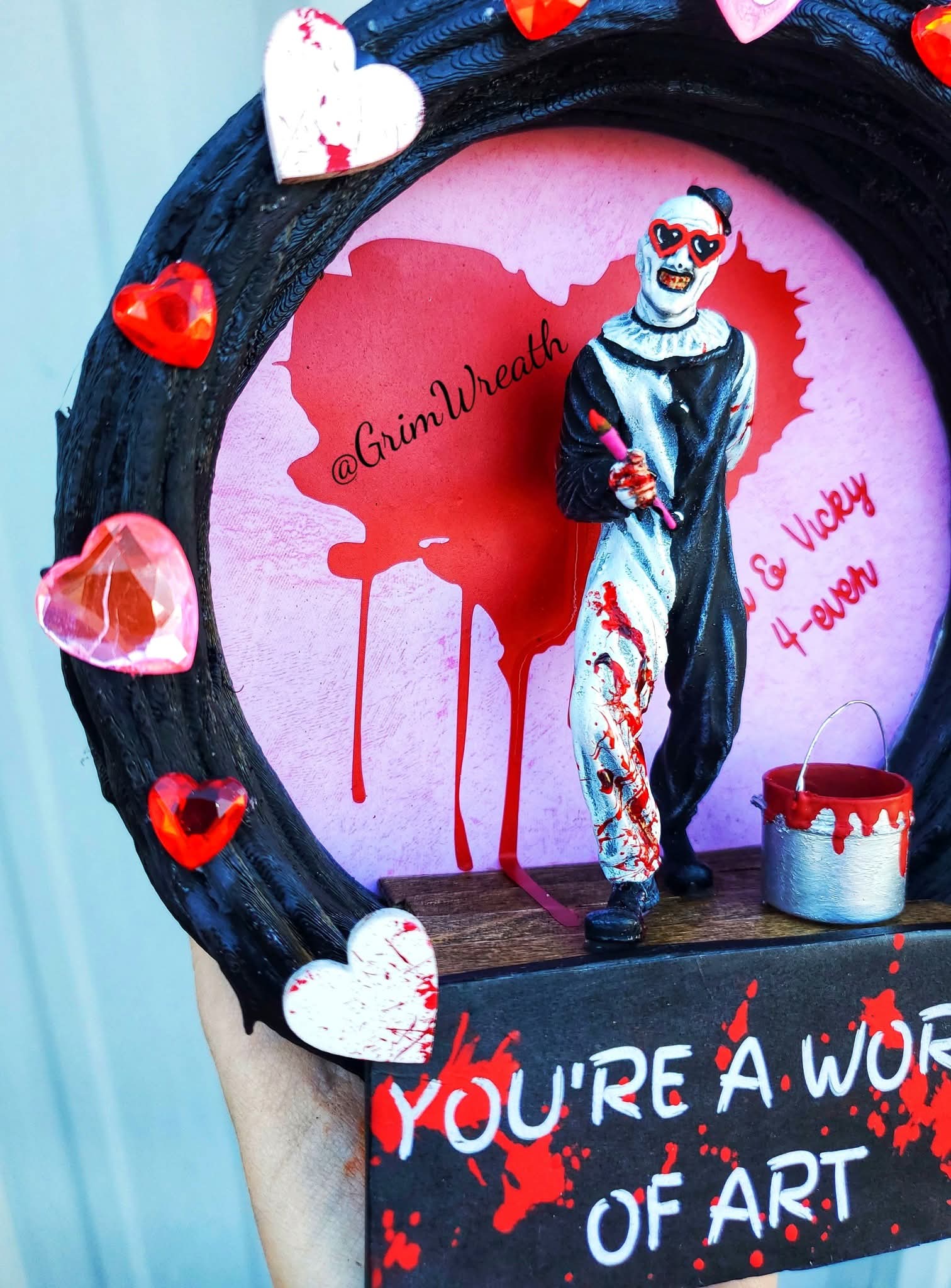 This 8" “Work of Art” mini wreath by Grimwreath is a twisted tribute, handcrafted with chilling detail—think blood splatter, black & white chaos, and a sinister smile—it’s the perfect piece for true fans!