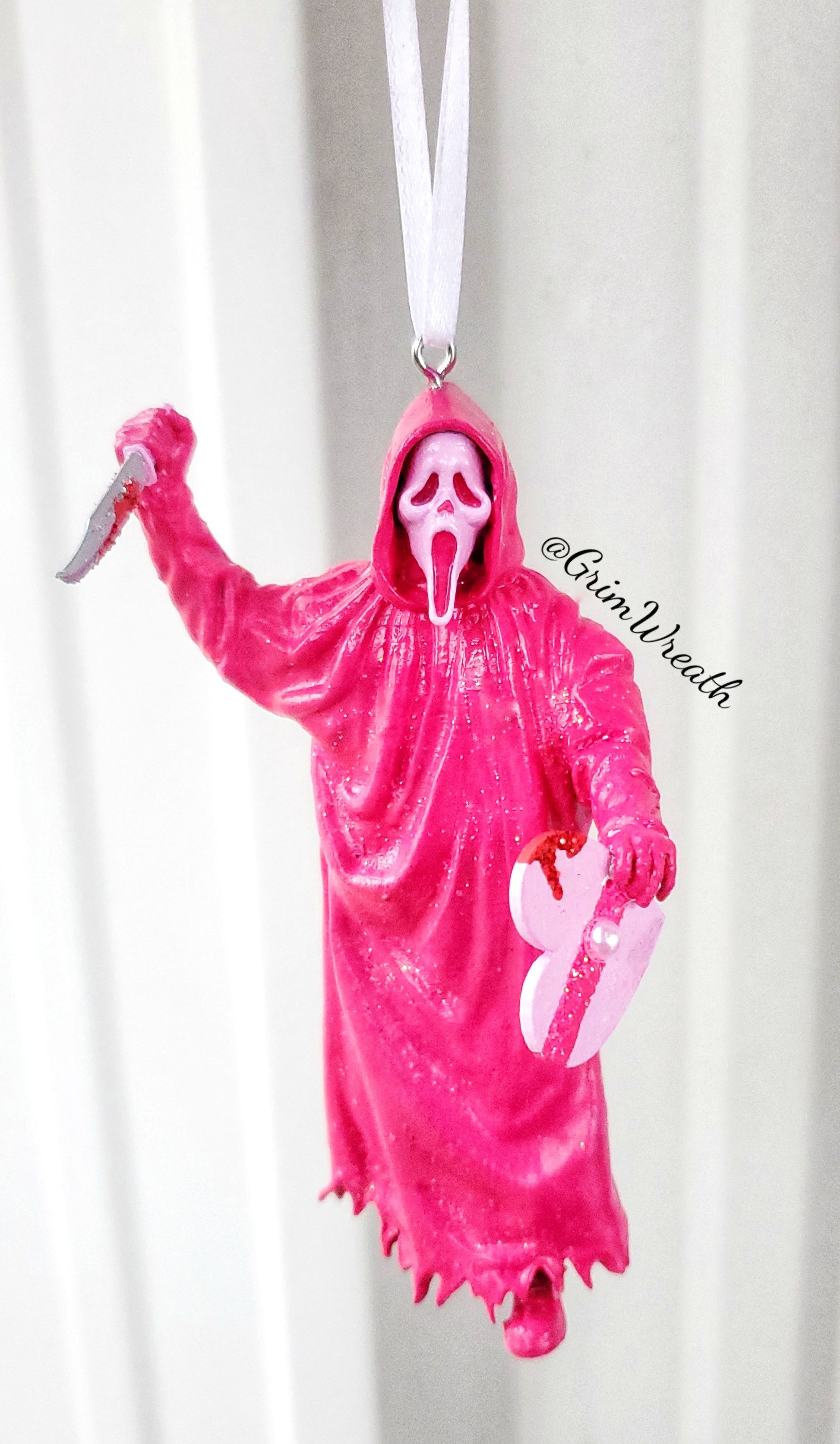 4.5 inch hand painted ornament by Artist Grim Wreath. Each ornament comes with a glitter and gloss varnish finish, and ribbon for hanging.